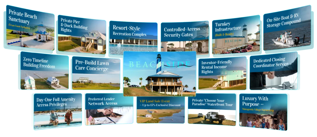 Beachside is a fully developed, resort-style, gated waterfront community located on a true peninsula in Palacios, Texas, surrounded by three bays. It offers extra large homesites, a private community beach, three fishing piers, a resort-style recreation complex, and controlled-access security. Beachside also features completed infrastructure, city utilities, and other luxury amenities at prices significantly lower than tourist-heavy coastal areas.